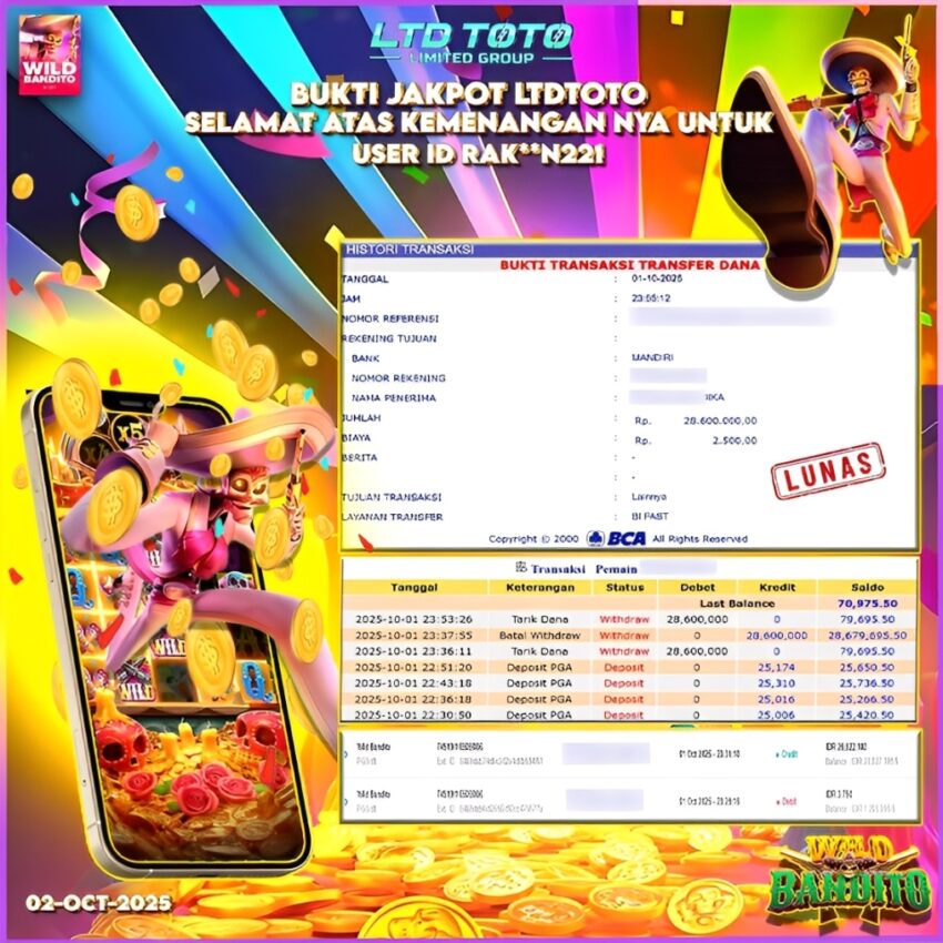 LTDTOTO JACKPOT WILD BANDITO RP 28.600.000 KAMIS 02 OKTOBER 2025
